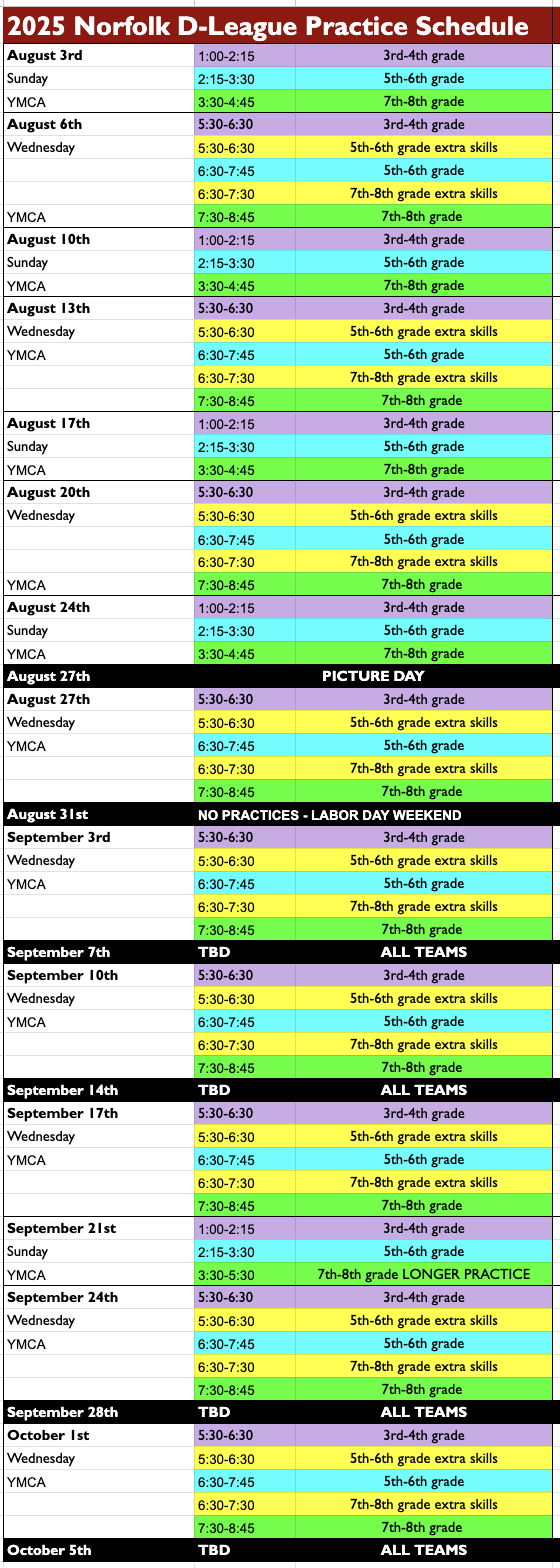 - Our tournament schedule will be posted when it is finalized. Practices will run from early August to the beginning of October.
