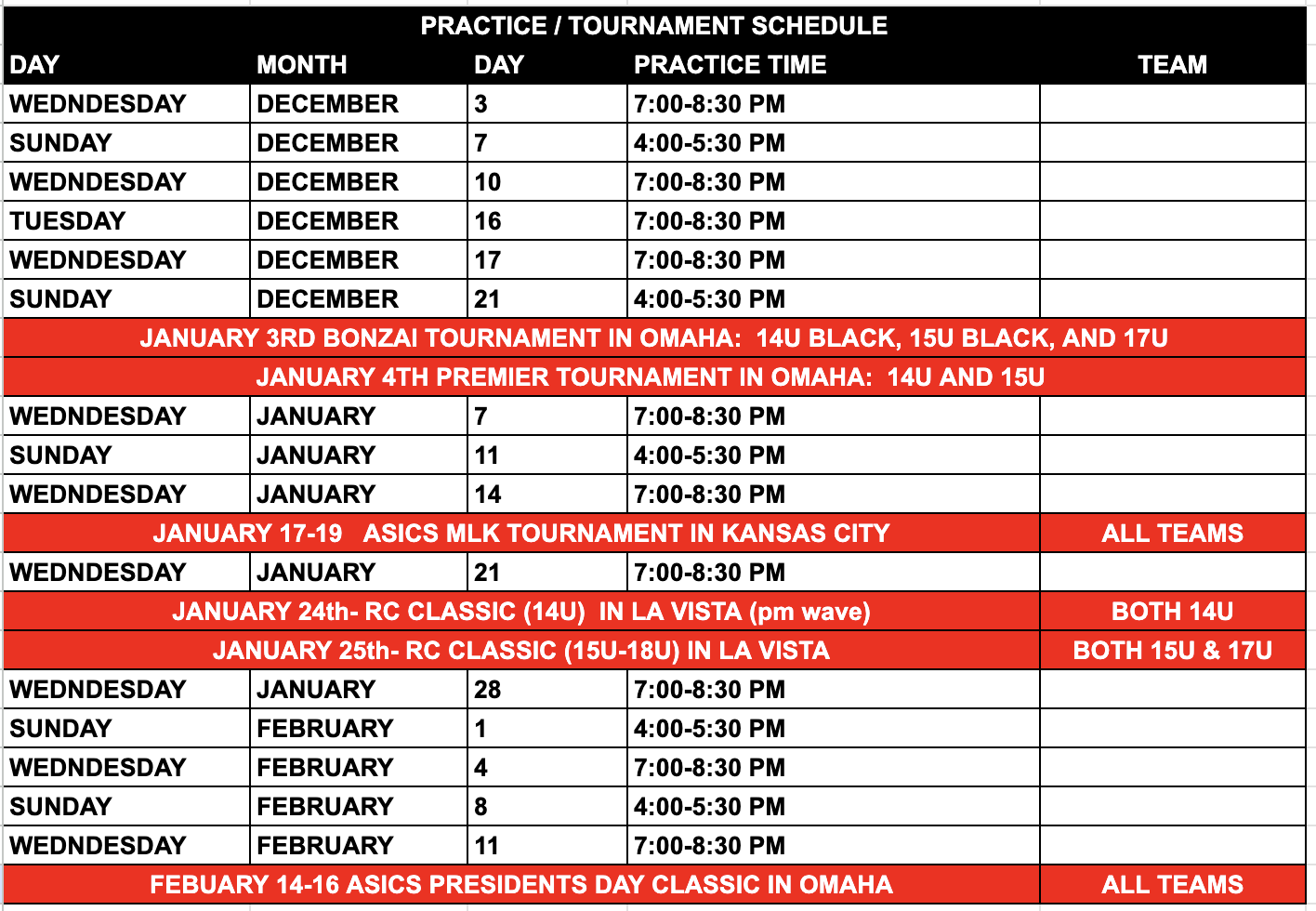 Practice format we will start ON TIME and have supplied our entire practice and tournament schedule with you already. We will have Pre-Practice warm up that players will be expected to do before practice. (In February, we will give the players time to learn the Pre-Practice warm up; along with any other warm up drills each respective coach might have for their players to be completed prior to their practice start time.) So, please NOTE to arrive in time to complete what you need to before your respective practice time starts. For example: if it takes you 5 minutes to put on your shoes and equipment and another 10 minutes to warm up, need to be showing up 15 minutes prior to start time of practice.